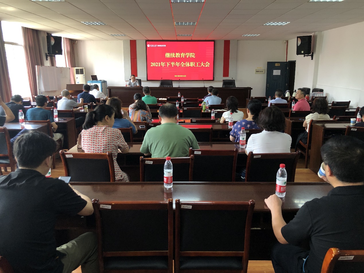 9月15日下午,学院在创业北楼401教室召开下半年全体职工大会,传达学校中层干部大会精神,总结学院2021年上半年及暑假各项工作,谋划部署2021年下半年重点工作。学院全体职工参加会议,会议由综合办刘向平主任主持。 党总支石共文书记首先传达了9月10日学校中层干部大会会议精神。在学校中层干部会上,田红旗校长回顾了“双一流”建设以来学校发展成效,分析了学校发展迎来的大机遇大挑战,强调全校师生要立足“两个大局”,心...