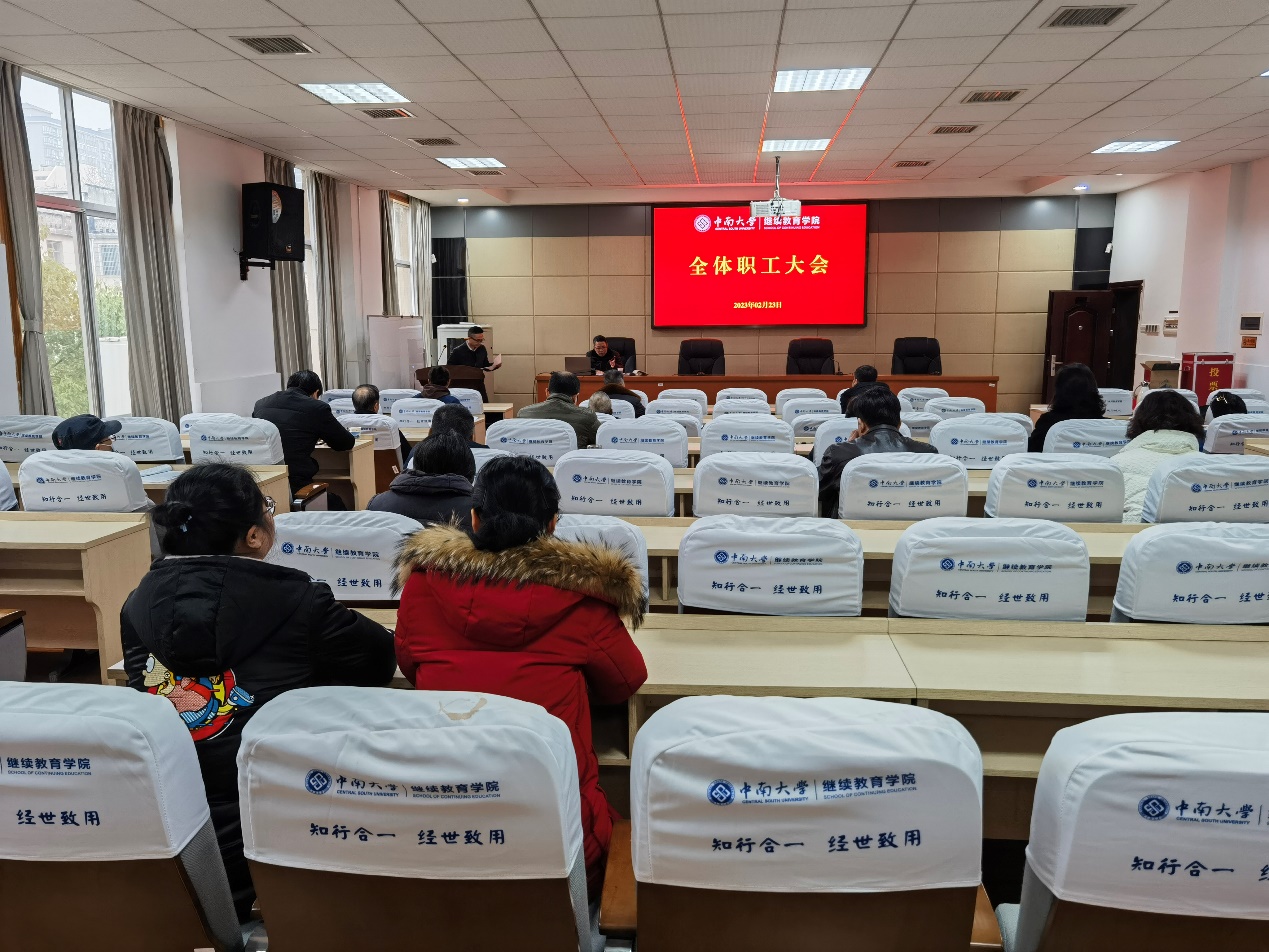 为贯彻落实学校决策部署与要求,扎实推进学院新学期各项工作,2月23日上午,学院在创业北楼301教室召开全体职工大会。会议由张峰副院长主持,党总支石共文书记做新学期工作思路与部署报告,学院全体职工参加会议。石书记通报了学校对全校继续教育发展提出的新决策、新要求,并结合学院班子务虚会议精神、科级干部座谈会上的意见建议,提出了学院新学期的工作思路:认真贯彻落实学校决策部署,抢抓学院发展新机遇,优化内部管理...