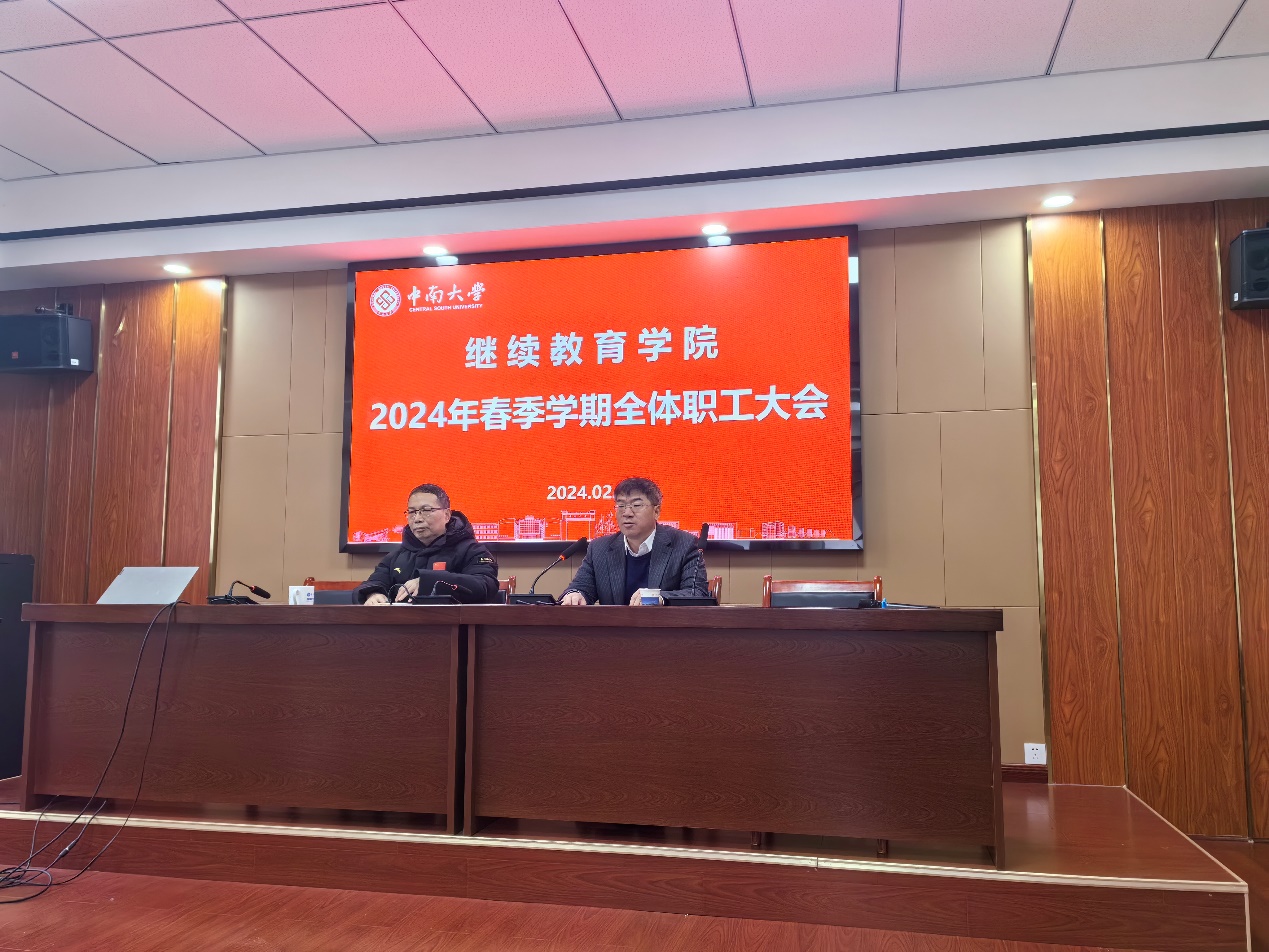 2024年2月29日上午,学院在新校区外语网络楼465教室召开2024年春季学期全体职工大会。会议由党总支书记石共文主持,院长李振田作工作报告,全体职工参加了会议。会上,李振田院长以《凝聚发展共识、强化责任担当,促进继续教育事业高质量发展》为主题,就学院2024年度重点工作和发展建设做了部署。李振田院长指出:一是做好党建引领工作,全面加强党的政治建设,扎实做好意识形态、思想政治教育与平安校园建设工作,提升党建工...