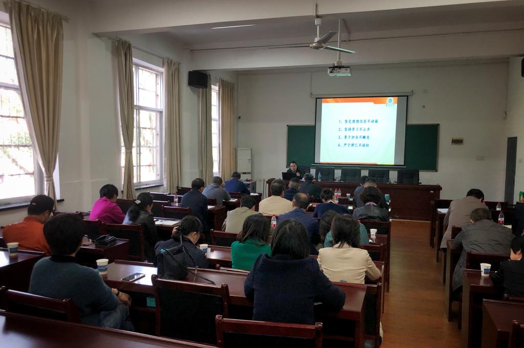 10月28日,学院党总支书记石共文以《守初心、担使命,推动学院快速稳定发展》为题,为全体在职党员、离退休党员代表主讲专题党课。校党委第四指导组组长柯朝晖同志到会指导。