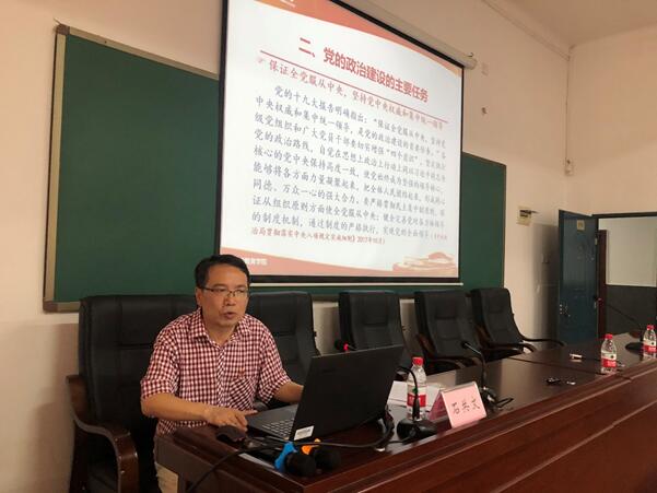 表彰后,石共文书记主讲《加强党的政治建设》的专题党课。他从政治建设的内涵、党的政治建设的主要任务、党的政治建设的实现路径等三个方面,结合学院的现状,进行了深入浅出的分析和阐述,进一步明确了学院党的政治建设的目标、任务和要求。他提出,学院当前党的政治建设最重要的是确保全院上下一心、全院一盘棋,共推学院的转型发展。