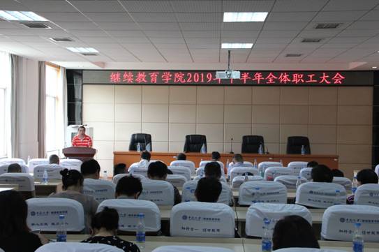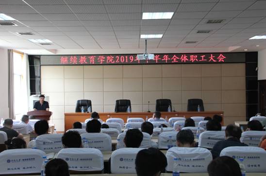 吴斌院长以“践行初心使命,再创学院发展转型升级新局面”为主题发表讲话。吴院长就学院2019年上半年的主要工作进行了简要回顾,经过学院职工和合作办学单位的共同努力、勤奋工作,学历继续教育确保了规范、安全、培养质量;非学历继续教育培训规模、效益、社会影响再创新高。接着从九个方面对下半年的工作进行了详细部署。一是持续加强党的建设,用“不忘初心、牢记使命”主题教育实效,推进学院事业发展,切实履行意识形态工作责任制,严防出现意识形态工作责任事故;二是进一步理顺学院内部管理体制机制,完善管理制度,充分调研、研讨,完善学院发展顶层设计,加快推进学院事业发展转型升级;三是加强学院职工队伍建设,强化业务培训和廉洁教育,切实提高综合素质和服务管理能力;四是加强对各类合作办学单位和合作项目管理,防范安全办学、廉洁、经费等方面的风险,凝心聚力,共赢发展;五是充分依托学校行业背景和学科优势,提高培训市场经营开发能力,主动服务国家重大战略需求,打造示范培训体系和精品培训项目;六是按照行业、主题和区域加快培训中心和基地建设,积极申报国家、省(部)级继续教育培训基地,开拓培训新的增长点;七是运用现代教育手段,开发建设中南远程培训平台,加强资源建设,利用多种教育形式扩大培训规模;八是加强文化建设、宣传工作、后勤保障、综治维稳、离退休工作、劳动纪律、执行力等;九是争取学校政策支持,力保职工待遇和晋升渠道通畅,探索制定学院内部非事业编管理和薪酬激励机制。