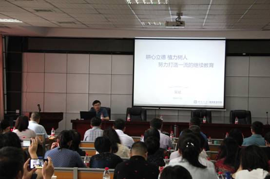 首先,学院吴斌院长以“耕心立德、植力树人,努力打造一流的继续教育”为主题,从三个方面带领大家分析继续教育形势、指明转型发展方向、提出培训管理要求、分享培训工作心得,努力构建一流的继续教育办学体系、保障体系、发展体系。吴斌院长指出,第一方面是高校非学历继续教育的发展定位与顶层设计,并从国家、学校、学院三个层面对非学历继续教育提出明确要求,根据继续教育的目标和任务,按照“了解需求、精心策划、引领市场”的工作思路,提出四项具体措施;要开展继续教育创新发展战略研究,并分析其意义和提出学院的转型发展模式。第二方面是培训管理的体制机制和管理流程构建,主要从培训管理的体制机制改革与建设、规范的培训管理服务体系、规范的办班管理服务流程方面进行了详细解读。第三方面是培训案例剖析,吴斌院长以三个典型案例同大家分享培训项目市场开拓策略、商务洽谈技巧、项目实施方案等方面的经验和体会。
