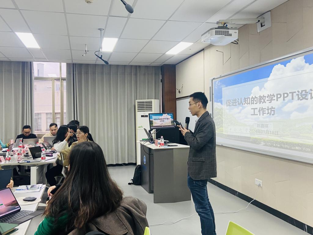 ▲yl88858永利集团土木工程学院副教授陈嘉祺主讲“促进认知的教学PPT设计”